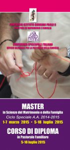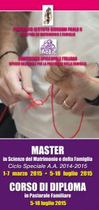 Dopo vari anni di sperimentazione si è oramai consolidata la proposta, nuovamente offerta nell’anno accademico 2014-2015, del Master in Scienze del Matrimonio e della Famiglia a Ciclo Speciale, frutto della lunga e feconda collaborazione tra l’Istituto Giovanni Paolo II, con la sua competenza specifica, e l’Ufficio Nazionale della Conferenza Episcopale Italiana per la pastorale della famiglia. Il ciclo di studi prevede la partecipazione a tre settimane residenziali per tre anni consecutivi, una in primavera e le altre due nel periodo estivo.